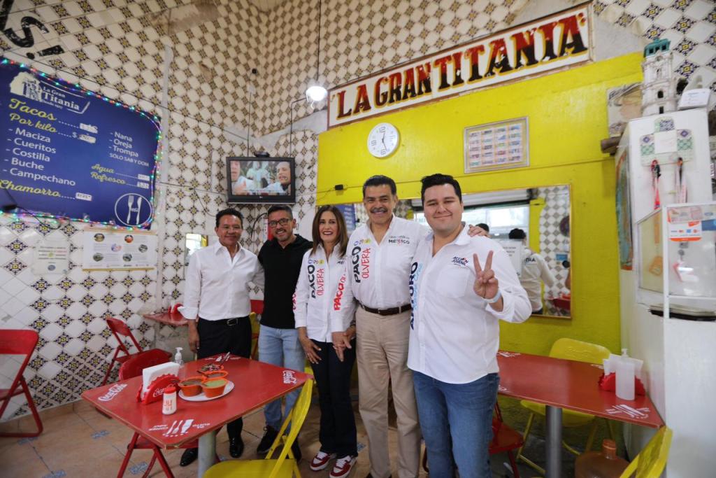 Al llegar a la tradicional “La Luz Roja”, una de las loncherías más conocidas de Pachuca, los candidatos Olvera y Viggiano dialogaron con los propietarios sobre temas de inseguridad e inflación en los productos y materias primas.
