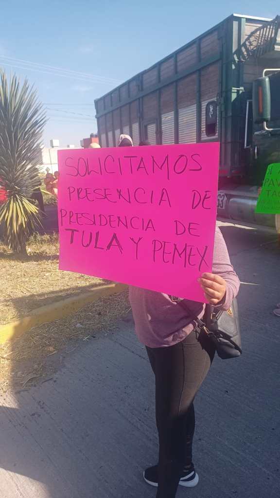 Alrededor de 100 personas cerraron el paso vial a la altura de Teocalco en Tula de Allende, Hidalgo para exigir la presencia de personal de Petróleos Mexicanos (Pemex).