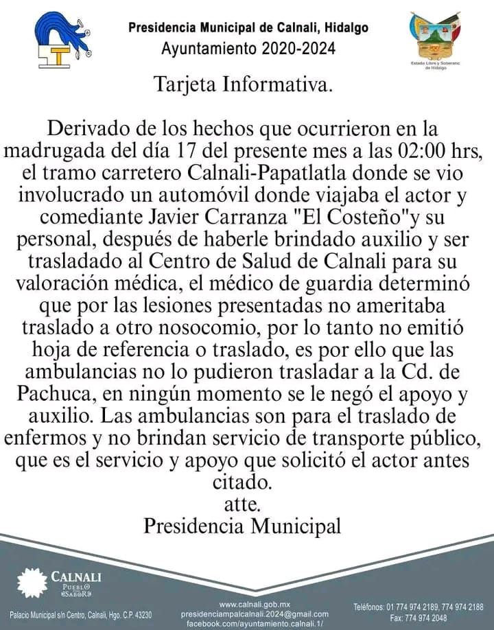 Luego de que el comediante «El Costeño» dio a conocer que sufrió un accidente sin recibir ayuda para trasladarse a un hospital en Pachuca, el Ayuntamiento de Calnali lamentó las declaraciones y acusó prepotencia.