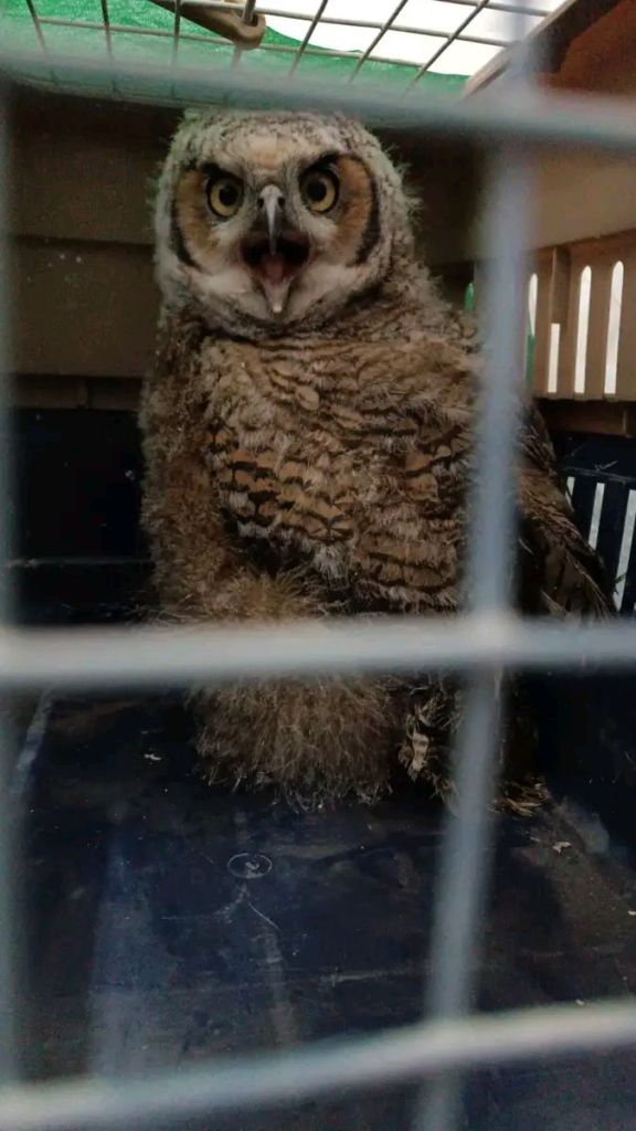 El búho cornudo cuenta con apenas una semanas de nacido, lo cuál es notorio porque sus plumas no están completamente desarrolladas y se ven «esponjositas».